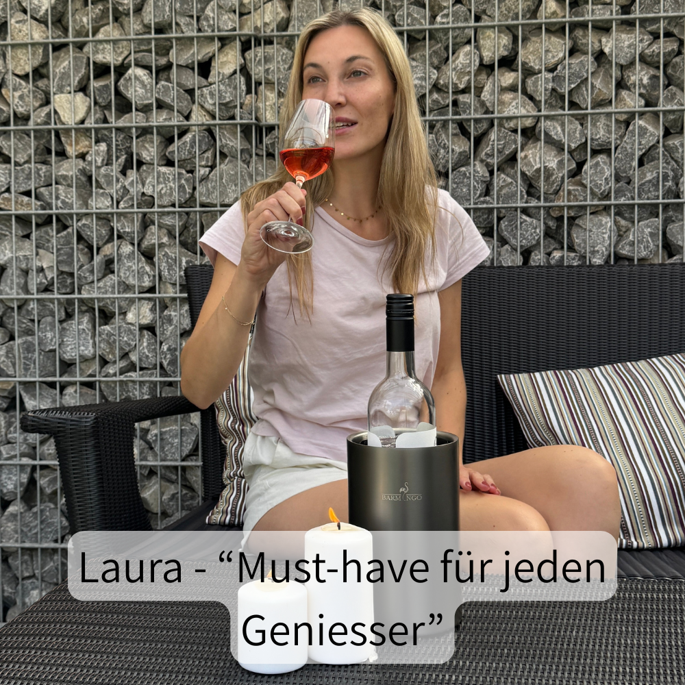 "Der Barmingo Weinkühler ist perfekt für gekühlten Genuss, egal wo du bist. Der doppelwandige Edelstahl hält Wein, Sekt oder Champagner stundenlang kalt. Für den Turboeffekt ganz einfach eine Kühlmanschette kurz ins Gefrierfach legen. Ideal für stilvolle Dinner, entspannte Abende im Garten oder einfach ein gemütliches Glas Wein. Der Barmingo Weinkühler ist ein Must-Have für jeden Geniesser und das kleine Extra, was den Abend perfekt macht."
