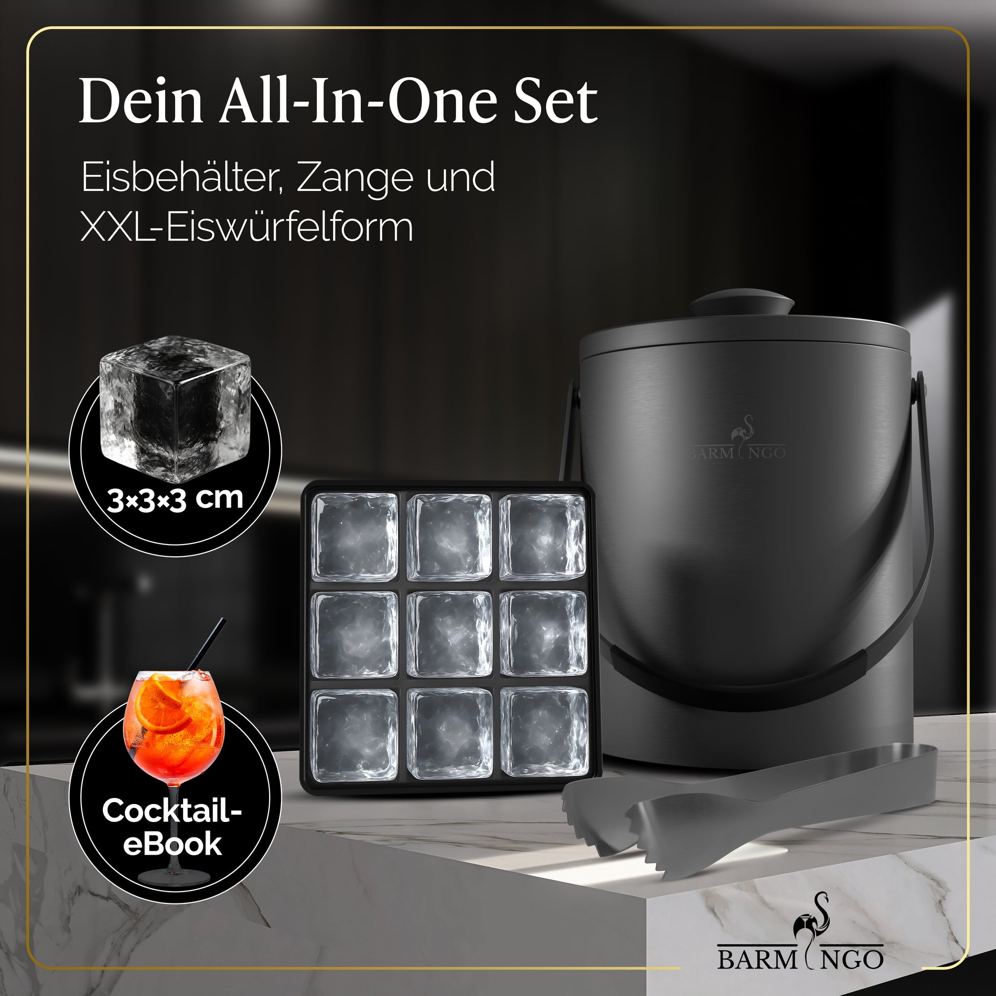 BARMINGO Eiswürfelbehälter mit Deckel | Farbe: Metallic-Schwarz | 2l Eisbehälter mit Sieb, Eiswürfelform, Zange