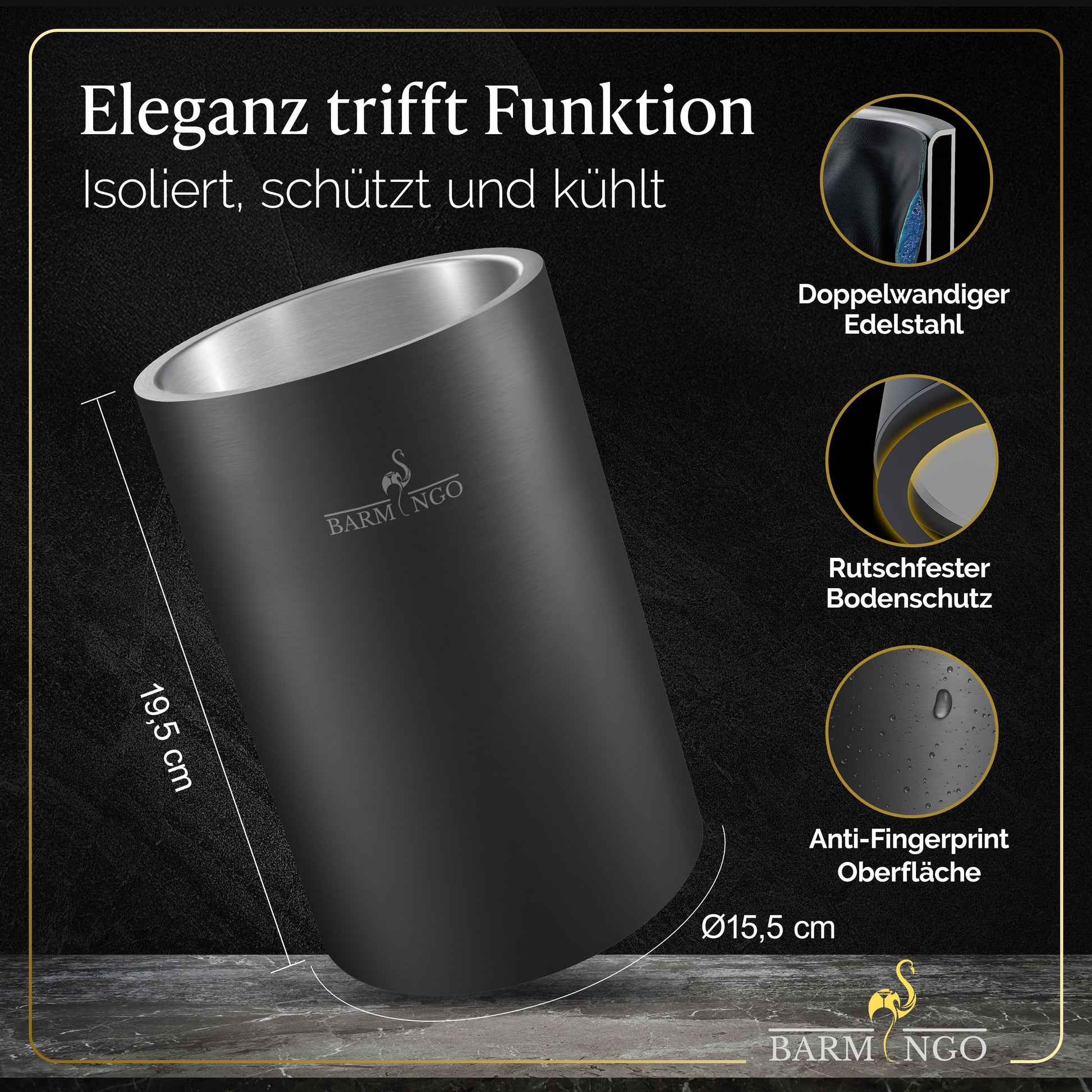 BARMINGO Weinkühler mit 2 Kühlakkus | Farbe: Metallic-Schwarz | Für Wein, Sekt, Champagner | Edelstahl Flaschenkühler doppelwandig